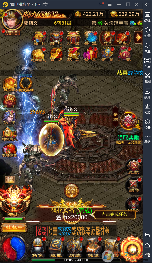 上线第一件事情,使用礼包码(czk666)兑换1000充值劵,然后在人物头像点击vip领取免费赠送的物品,领取物品之后,下方图标上出现红点的都是可以去提升的,提升之后人物的战斗力也会相应的提高,然后在杀怪途中速度就会更加快。进去游戏之后,跟着游戏任务走,到了20级的时候左下角就会出现自动挂机的图标,点击自动挂机你就可以释放双手,让人物自己在游戏世界里面提升自己,然后到了58级,你就可以在主界面右下角点击副本-全天活动进去经验副本,这里注意一下,进去之前先把自己的人物属性提升到最大再进去挑战,评分越高的话经验值就越多,就可以快速到80级,开启自己的转生之路。