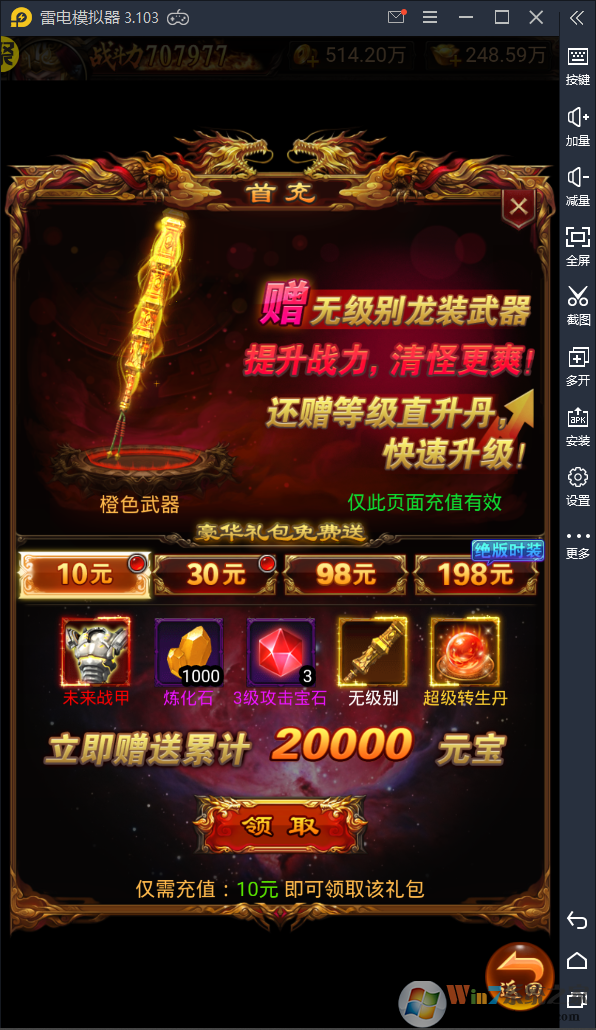 豪华礼包:超级转生丹*1,强化石*100,羽毛*50,金币100万 VIP7777