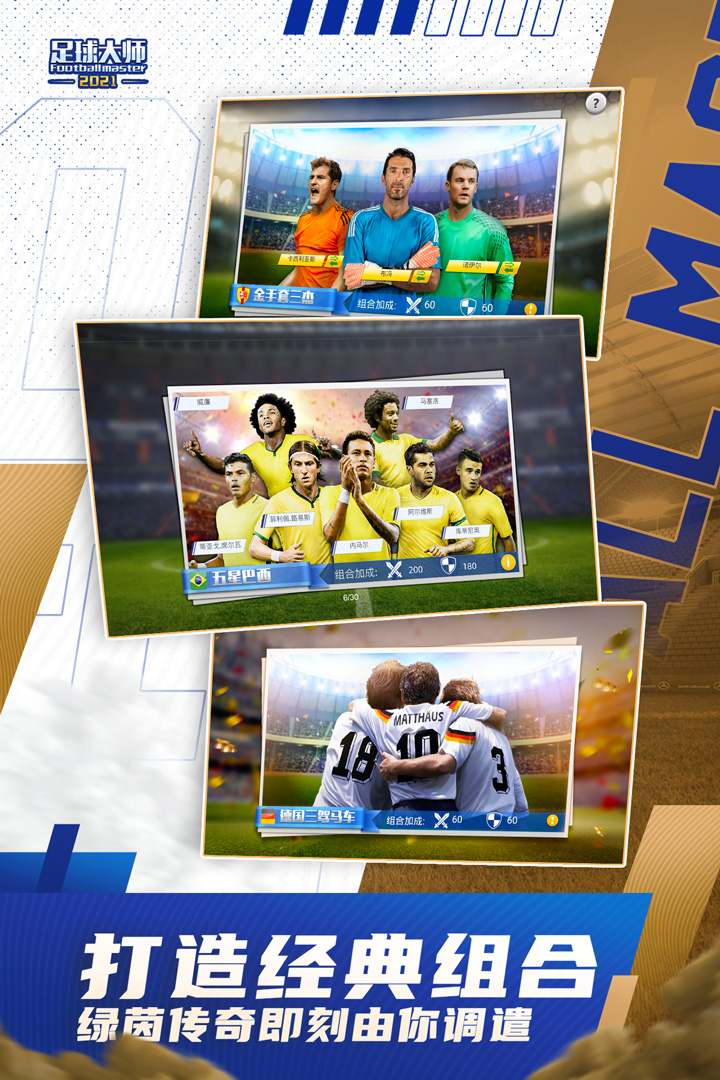 3、大师联赛:玩家将参与到欧洲顶级联赛的争夺中,更有机会获得欧冠和欧联奖杯等终极荣誉。