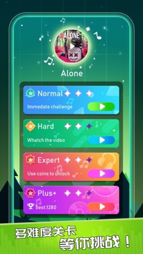*单手操作简单易玩,每首歌曲划分不同难度,由简至难。既满足大佬的挑战欲望,手残党也可以轻松full combo!