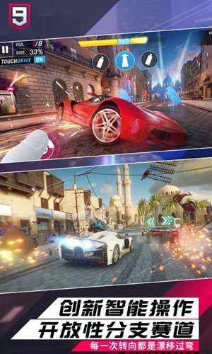独具匠心的全新TouchDrive™操作模式,轻松上手每一场比赛,可以让玩家全身心体验比赛的乐趣!同时你仍可以切换至“点击转弯”操作并自定义屏幕按钮的位置,也可以使用“倾斜转弯”,像专业车手那样驰骋赛道!