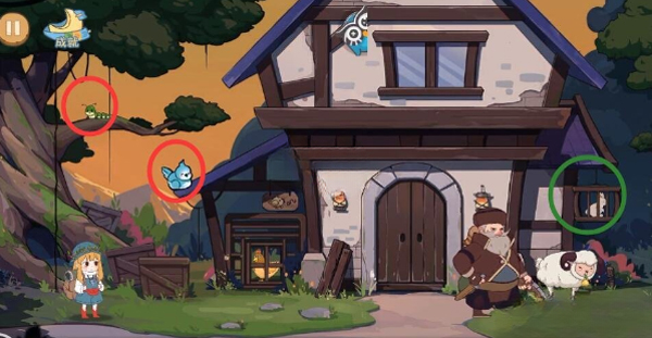 用鸡蛋投掷猎人掉落银色钥匙,开小猫门点击按钮;