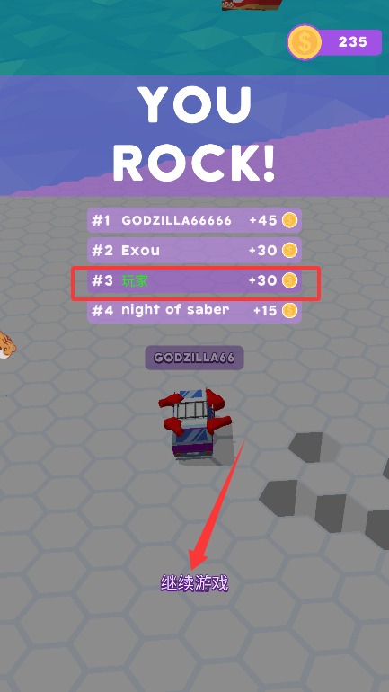 4、一旦车辆掉落即视为失败,可查看本局排名与获得的金币,点击“继续”重新开始游戏。