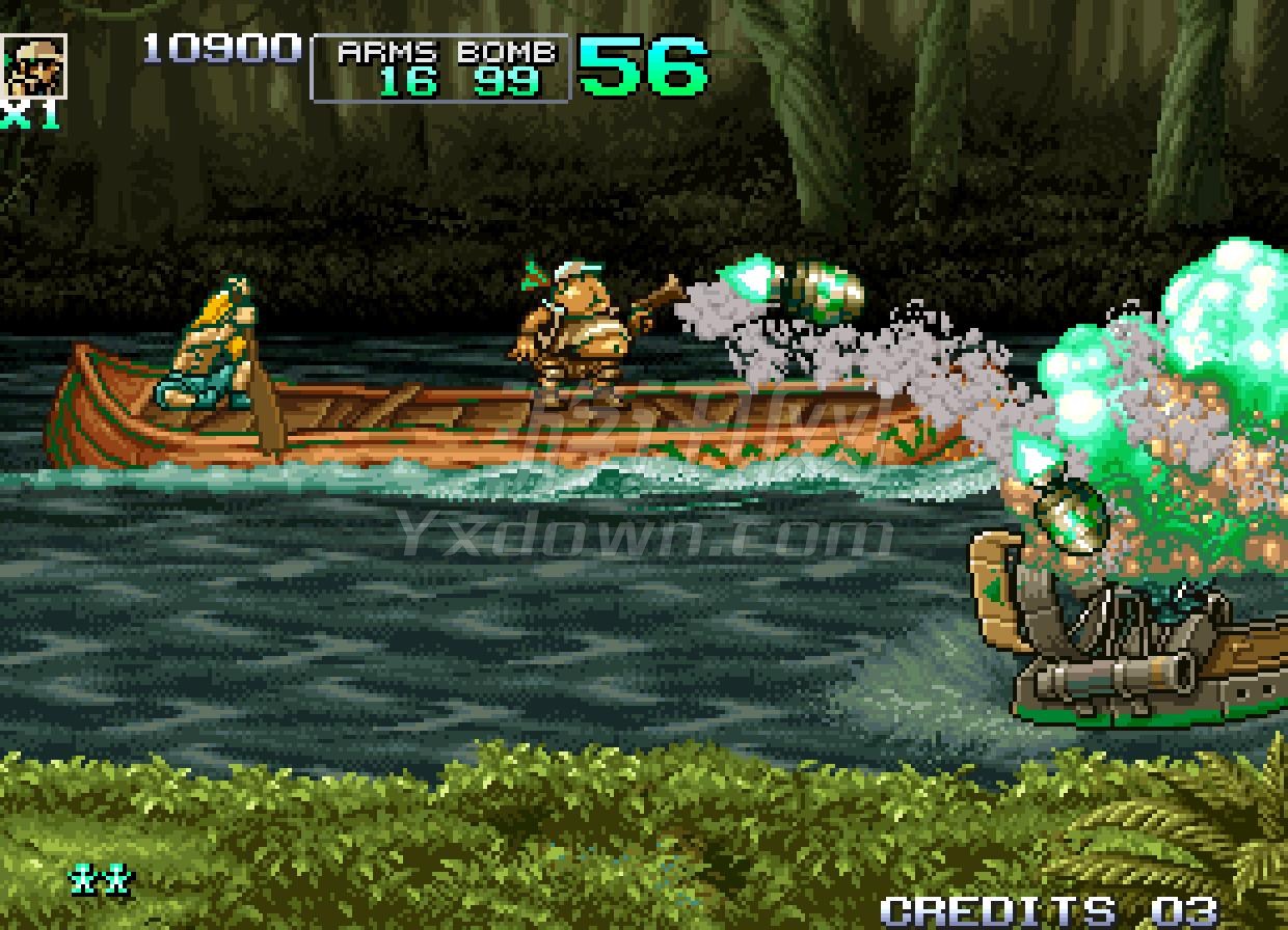 采用经典的2D像素绘画风格,SNK御用画家绘画,场景角色完美还原,枪械战车全部登场。