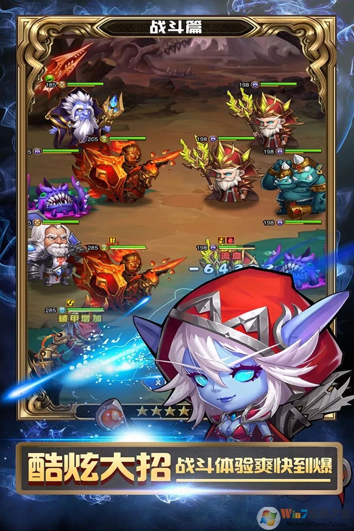 1、Q版英雄,萌动十足,骨骼动画细腻演绎英雄对决!独创英雄骨骼动画技术,激萌十足,英雄技能效果华丽,微小到英雄表情的极致生动,带给你无与伦比的临场交互体验。