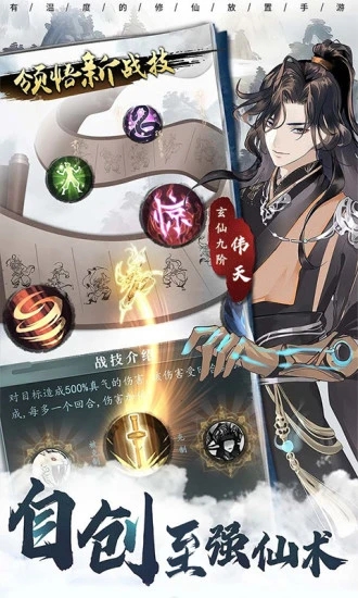 1、自创绝世仙术,创造者命名,得道成仙之后更可流传后世;2、可学习多个仙术,每个都有独特效果,出招轮换,考验策略搭配;