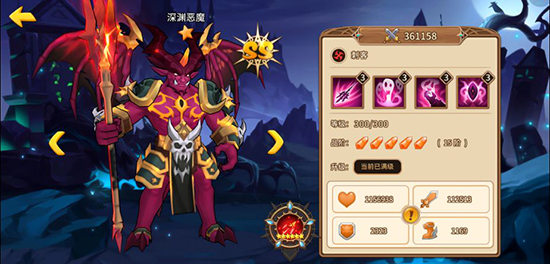 暗系阵营的深渊恶魔,职业是刺客。第三被动技能“恶魔降临”:生命为0时直接回复80%生命值,解除受到的所有控制、中毒。燃烧和流血效果,进入恶魔状态直至英雄死亡。恶魔状态下,每次攻击都将以奥义进行,在每回合结束时生命减少25%,真是厉害到令人瞠目结舌。