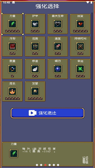 像法杖的攻击能够追踪,鞭子的攻击只能横向,骷髅会满屏幕的弹等等。这些武器都是玩家初始角色会自带的,而之后强化自己的只能很幸运的从升级后的三个选项中选择,而这选项是随机的,它可能刷出3个都是玩家需要的,又有可能三个都不需要的,再结合不同的其他道具进行升阶,比如说法杖升阶后就不再有冷却;鞭子升阶后就能吸血等等。