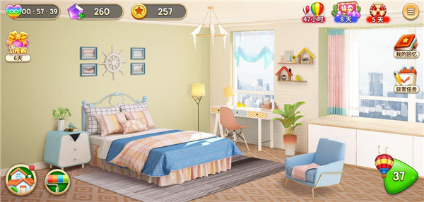 6、玩家可以在游戏中根据不同搭配建造房屋,让房屋从蓝图变成你美丽的小家。每一次布置房屋都需要安排任务,这样就充分利用了建造与消除之间的联系。让玩家们在建造的同时,主动去完成消除挑战任务,利用消除来获得金币和行动力,用以完成建造。