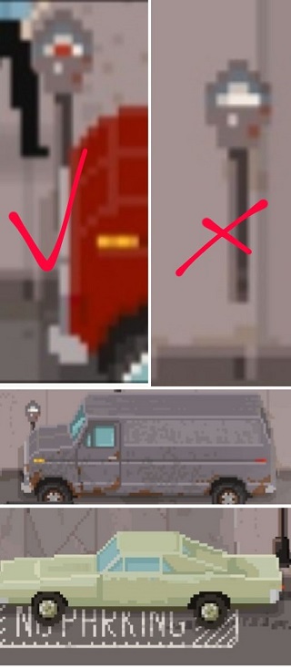 在每辆车前都有一个杆子,如果杆子上有个红点代表停车超时了,要开个违规停车罚单,如果一个地方地上写着“no parking”也要开个违规停车的罚单。