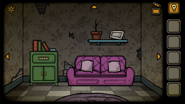 1、进入游戏后,点击开始。这里先熟悉一下游戏界面。界面的右侧是放置物品的物品栏。界面四边黄色的小三角是用来切换场景的。右上角的小电灯是提示按钮。左上角的小齿轮是打开设置按钮。