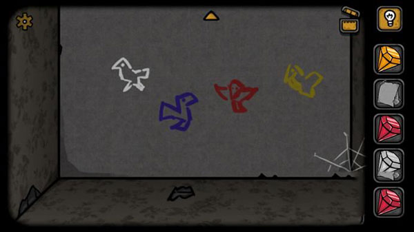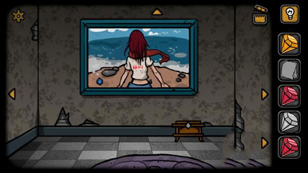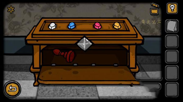 9、在切换到海报的房间。点击海报下面的宝箱,将钻石按照小鸟的颜色排列方式进行排列,就可以打开这个箱子,获得一个印章。