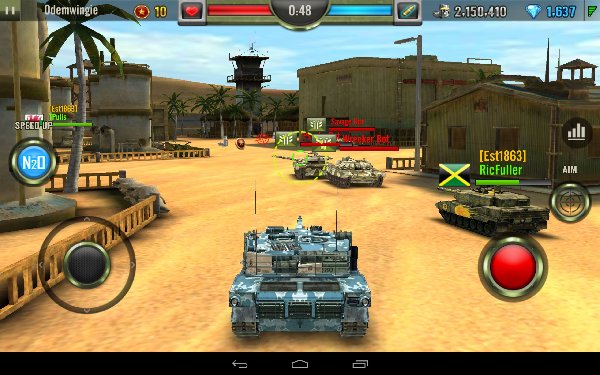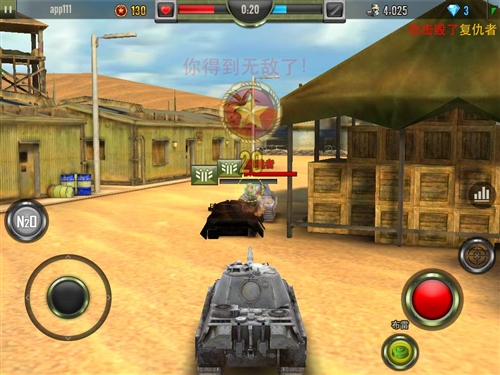 战斗模式分单人乱战或是组队厮杀两种,规则没有复杂的条件限制,以最终所猎杀的坦克数量较多的一方或玩家为胜利者。基本上就不用想太多反正看到能打的敌人就给他毫不犹豫的轰下去就没错!实际操作方面则是虚拟按键触控,以左下角方向轴控制战车的移动,右下角则是开火键。每辆战车的生命值一旦归零就必须等待一定时间复活。