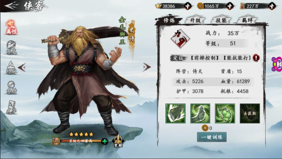 拥有不错的侠客之后,我们就可以根据侠客的属性组建自己的初始阵容。游戏分为掌、剑、力、气、技五中职业,前期阵容以平衡为主,最好每个职业的侠客都能有一位在阵容中。组建好阵容后,我们就可以对侠客进行强化了。点击屏幕下方的侠客按键,进入侠客选择界面,选择我们要强化的侠客进入强化界面。