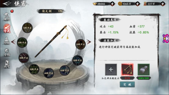 侠客强化除了最简单的属性强化之外,当侠客达到一定等级或星级之后,还能够开启左侧的专属强化功能。专属强化能够针对侠客的职业大幅提升侠客的基础属性,使你的侠客在战斗中能够具备更强的战场能力或输出能力。专属强化需要用到侠客专属的人物碎片、武学碎片和武器碎片。人物碎片可以通过酒馆招募获得,专属武器碎片可以前往独孤剑冢精英挑战模式或血浴神兵副本,通过战胜敌人掉落获取,武学碎片可通过副本襄阳之战副本掉落获取。