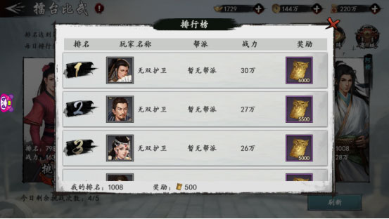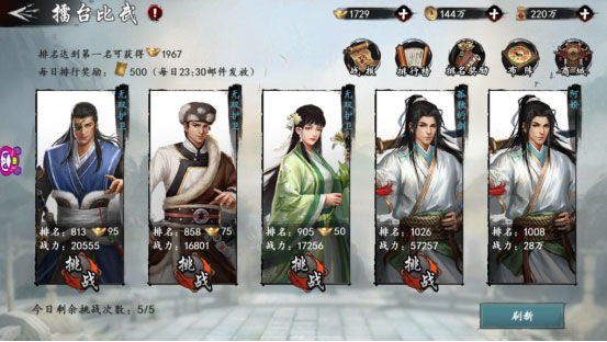 在擂台比武中,大侠可以选择心仪的比武对象并发起挑战。位于最右侧的是大侠自己的当前排名和战力。挑战对手前可以先行查看对方的战力和排名,这样才能知己知彼百战百胜。每日共有5次挑战次数,如果你对场上的四位对手不满意,还可以选择刷新,随机更换其他对手供大侠挑选。