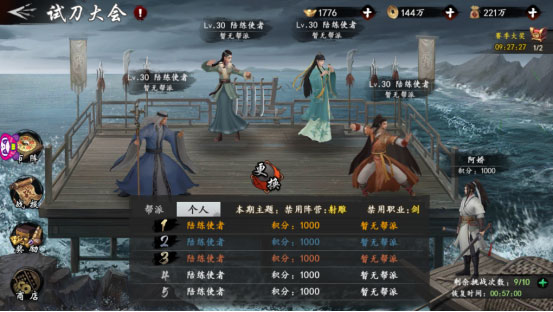 试刀大会挑战次数每小时回复1次,最多存储10次。每赛季都有各自的主题,会对部分阵营或职业进行禁用,大侠无法派对应的侠客进行出战。如本期禁用的阵营为射雕,禁用的职业为剑,如果准备不充足甚至有出阵人数不足的情况发生。所以大侠一定要扩充自己的侠客数量,这样才能有备无患。
