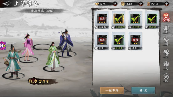 在游戏前期,我们可围绕一名卡面较为优秀的角色组建自己的初始阵容,从而更好的推图过副本,为游戏中后期累积资源。在游戏主界面点击酒馆,进入侠客招募界面,不用太在意传奇侠客的抽取,前期只要有稀有或史诗级别的侠客就足够我们完成日常任务获取资源了。