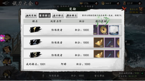 试刀大会以每周二到周三、周四到周五、周六到下周一为一个赛季。赛季首日早9点可以开始报名,每日23:00-23:30进行结算。挑战对手胜利后可以获得积分,对手将扣除积分。每个人赛季奖励结算后,积分将重置为初始积分1000点。