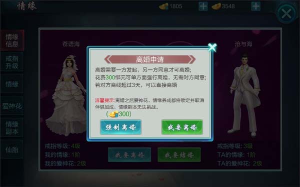 2.单方强制离婚,为单人操作,需要扣除发起方300绑定元宝。