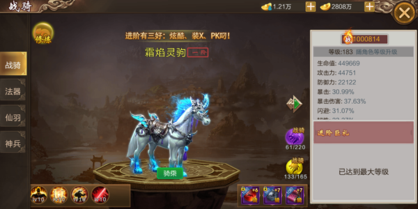 1.战骑不仅仅只是一个交通工具,更可以增加人物角色的各项属性,提升战骑的阶数,不只增加更多的属性,并可获得更炫酷外形的高级战骑。