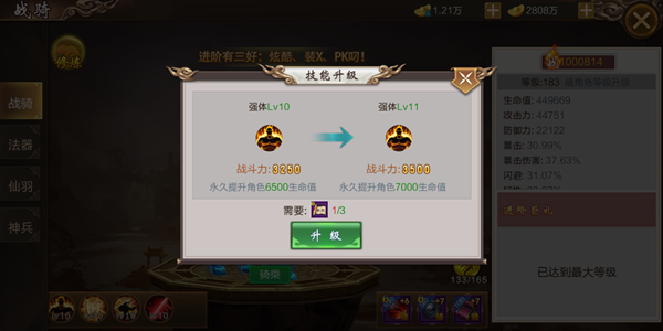 4.战骑的技能可以通过使用战骑技能升级书来进行升级,升级过后的技能增加更高的人物角色属性。