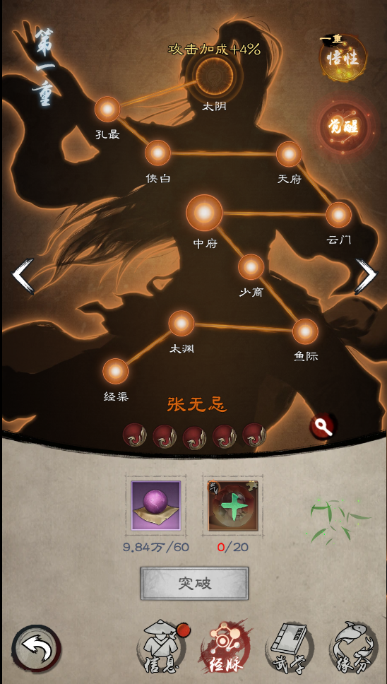 主线副本达到17幕、侠客等级达到27级开启经脉功能,经脉突破需要消耗经脉突破丹去点亮经脉上的穴位,点亮每个穴位能获得大量的基础属性数值加成或某项百分比数值加成。