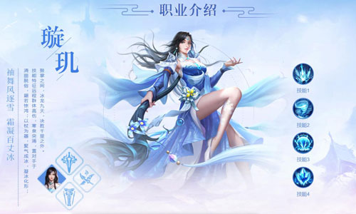 璇玑清丽脱俗,翩若惊鸿;以杖为器,聚气成冰,凝冰化形;技能特征远程群体高伤,寒泉突涌,置对手于鼓掌之间,冰龙九天,决胜千里之外