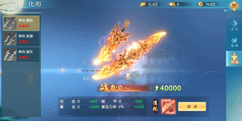 海量暴击属性;激活神兵外形可以按百分比提升暴击属性,并获得专有的外形显示。
