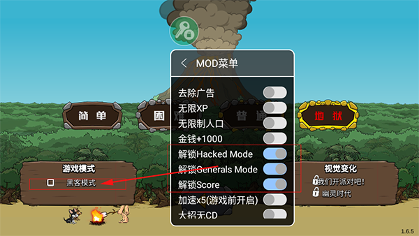 PS:有修改菜单功能供玩家自由开启,其中包涵黑客模式、无限xp、去除广告、无限人口、无限金币、加速以及无限大招等多种修改功能。