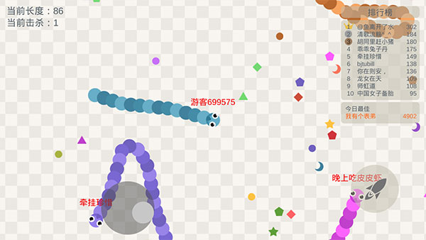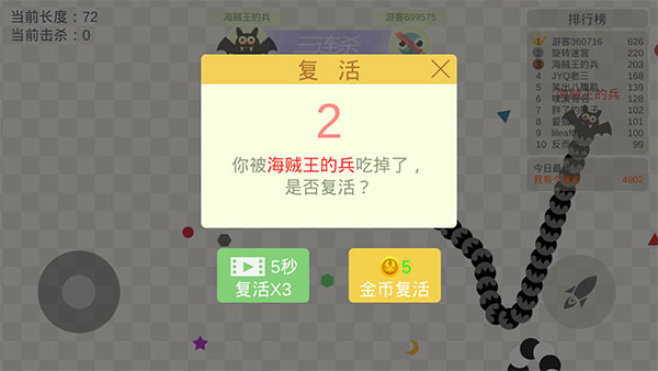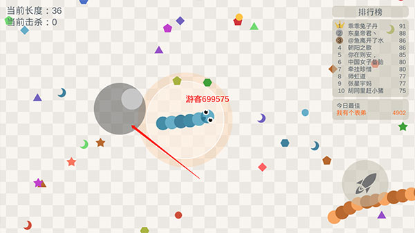 2、可以通过虚拟按钮来控制方向和熟读,前期建议多吃彩豆来壮大自己