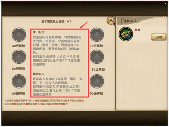 每种武学配上特定的几种内功就能激活特定的心法效果,可以通过点击套路界面