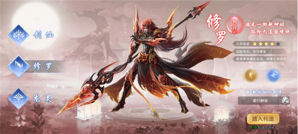修罗是游戏中的物理输出型职业,擅长近战单体攻击,招式大开大合,攻守兼备。同时拥有着所有职业中最强的单体爆发连招,能够冲锋近身,释放强力控制,是破阵对敌的一把好手,入手难度四颗星。