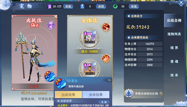 2、宠物是修仙之路必不可少的重要伙伴,宠物合体是可以增加自身的属性,出战每一个宠物都有一个特殊的技能,在战斗中可以发挥极致的效果哦~