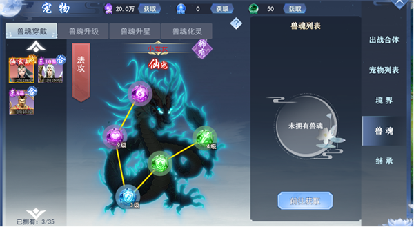 4、宠物兽魂有物防,法防,生命,物攻,法功,法防属性,金色兽魂可以获得更高阶的属性,仙友们可以在兽魂宝库获得金色兽魂!!