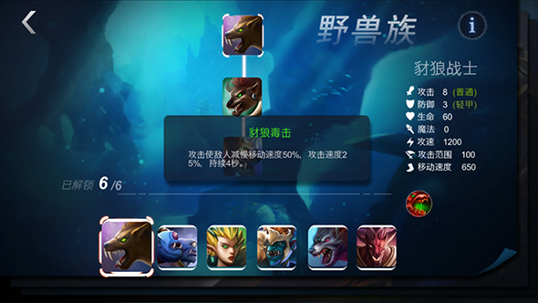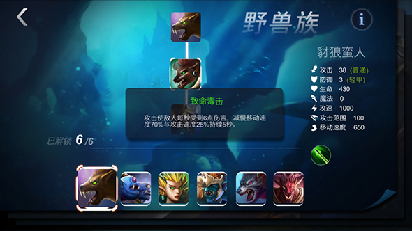 豺狼战士:野兽族一级兵技能:豺狼毒击(攻击使敌人减慢移动速度50%,攻击速度25%,持续4秒)