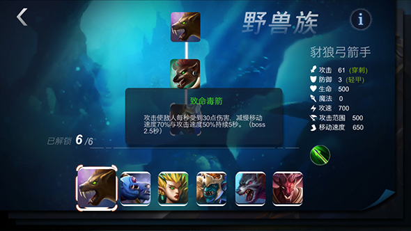 技能:致命毒箭(攻击使敌人每秒收到30点伤害,减慢移动速度70%与攻击速度50%持续5秒,BOSS2.5秒)