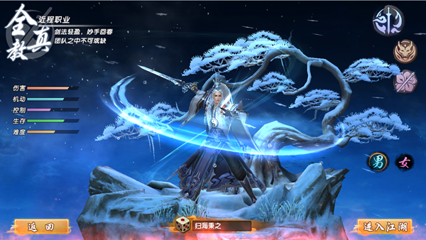 进入游戏后,点击【创建角色】按钮,进入创建角色界面,全真教、丐帮、桃花岛、三个不同的职业选择。