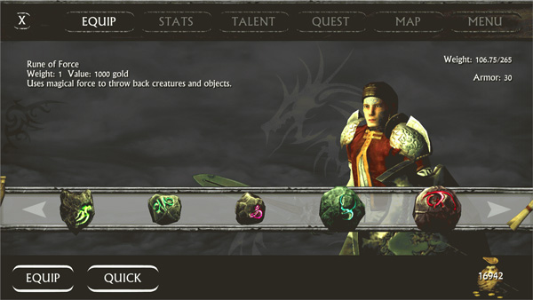 2、游戏的物品携带模式比较好,采用重量计量,而不是传统的格子方式。你想啊,10个戒指占10个格,10把剑占10个格,但明显不是相同重量嘛,所以格子不科学。重量计量很真实,可以通过增加体力点数提升重量值,可以多背点东西。东西超过体力上限会速度变慢。