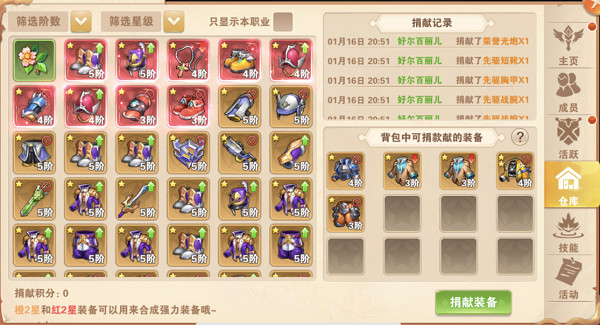 3、公会仓库,玩家通过捐献装备来获取捐献积分。