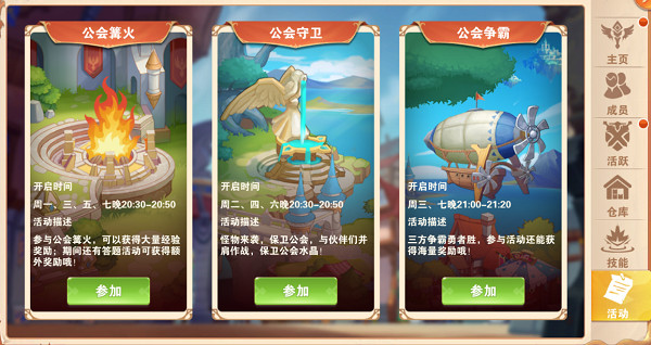5、公会活动,公会活动的说明及开启时间,活动开启后可以通过游戏主界面右上角活动图标进入活动。或者在公会-活动界面中选择活动进入哦。