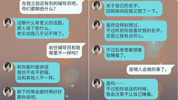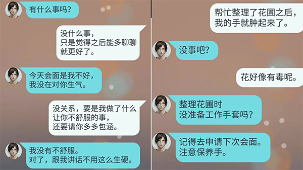 而《掌心》把这点做的很好。作为玩家,我们本身就会对男主有一定的好感基础。游戏中男主的设定是无法走出小屋子,作为辅导员,关心行动不便的男主一定角度上是我们的责任。游戏过程中,我们给生活条件不好的男主送去生活用品、书籍、CD等。有时候自发的去食堂点菜送给他吃。这些行为与结果是通过玩家在地图中探索,在信息中对话触发的,给玩家一种亲力亲为的感觉。于是,这些让男主有好感的行为成为了我们自发的。所以,男主在失忆的情况下,受到玩家关怀,自然而然对女主有了感情。这样一来,玩家不会觉得突兀,甚至觉得自己的努力得到了感情上的回报。这就像我们的生活,结果是堆砌起来的。根据男主回信息的速度就可以看出。前期男主回信息的速度是非常慢的,但随着剧情的推进,他回复消息的速度也会越来越快!