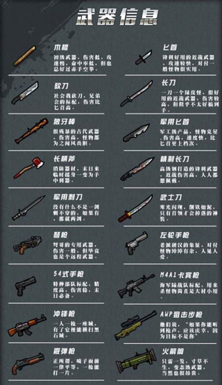 2、近战武器包括初级的木棍,匕首,中级的狼牙棒,长刀,高级的斧头,刺刀等等。