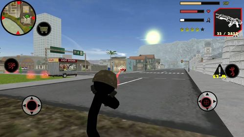 左侧移动、加速,右侧绳索,攻击(跳跃),跳跃,右上侧的武器更换以及血量、经验的显示都实时更新,一览无遗,凭借着大家自由的玩法,与其他帮派的人物进行交火,期间杀人能够获得经验,杀多了会产生星级,警察和其他附近角色会特殊照顾你对你展开火热的进攻,而如何存活,如何将其他人物击杀则是你所需要完成的任务。