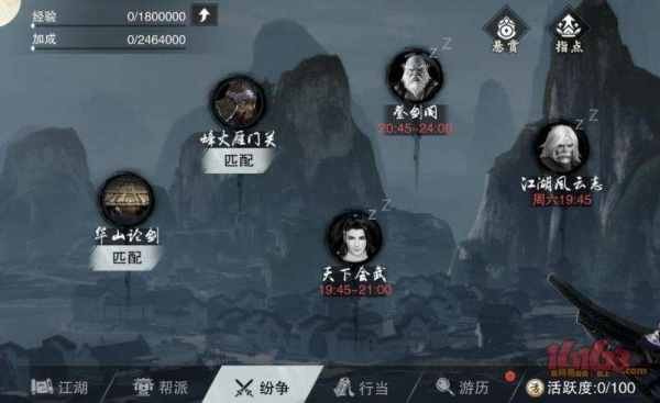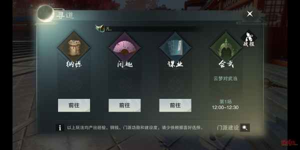需要指出,万里听风,寻道(武当的单人门派任务),江湖纪事,帮派任务属于可挂机休闲玩法;其实除了万里听风可以全程挂机,寻道和帮派任务的第一步或者最后一步都需要手动操作,特别是纪事副本最好不要挂机,进入副本前会提示多少修为才能开启挂机功能,如果修为不够,全程只会跟随队长而不打怪,队长看到这种人一般都会踢出队伍的。