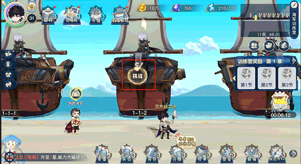 【玩法入口】界面中,点击【关卡挑战】按钮可以显示挑战详情,包括目前已完成的关卡和当前的挂机奖励累计收益,点击【立即前往】按钮也可直接传送到海军训练营场景中。