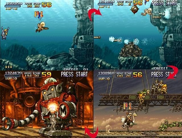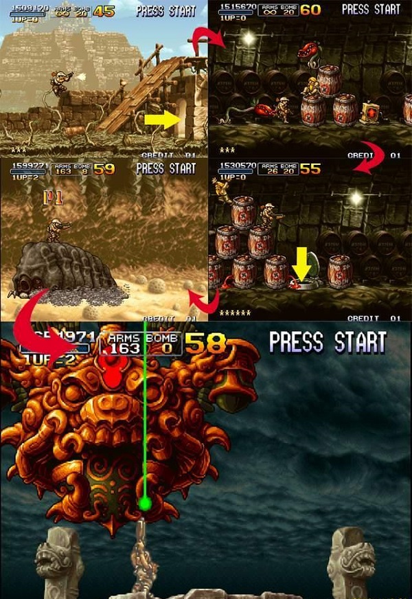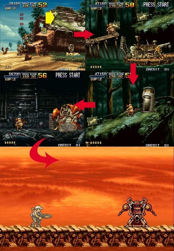 不知道大家注意到没有,其实在《合金弹头1》和《合金弹头2》中就已经有了隐藏的路线,只是不是那么明显,不会场景切换。