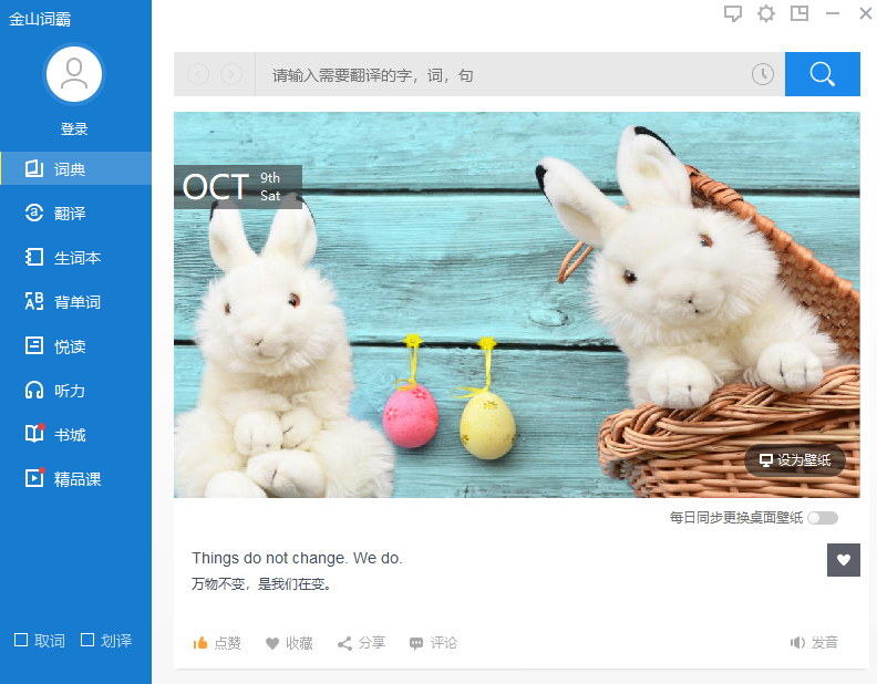金山词霸PC个人版是一款非常受欢迎的查词翻译词典。经过多年锤炼,已经非常成熟了。金山词霸PC个人版为用户提供了在线翻译、在线词典、英语口角、英语学习资料、汉语词典等功能,海量内容、权威翻译是它最大的特点,收录了141本版权词典、32万真人语音,另外还有2000组常用对话,无论是英文阅写,还是听读口语,都能满足你的需求。