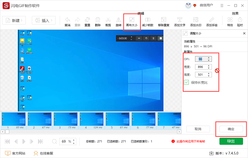 6、Ctrl+A全选所有帧数,点击【画布大小】,输入长宽数值,默认保持长宽比,点击【确定】;
