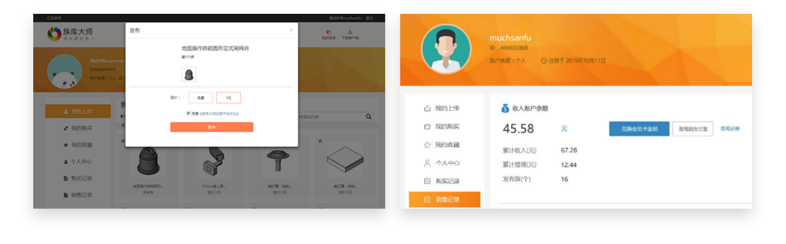 将上传的族一键发布到网站,其他用户购买后,收入分成直接流入您的收入账户中。
